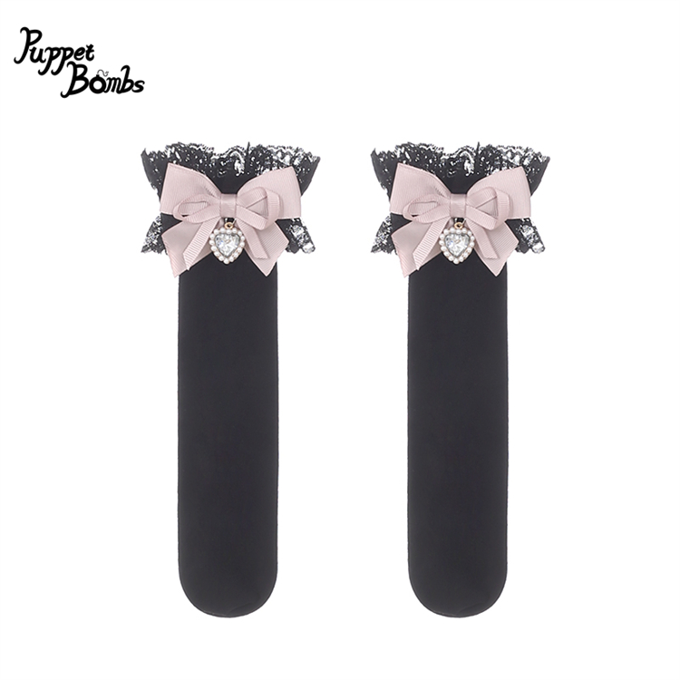 ハートビジューリボン付き総レースデザインのハイソックス。